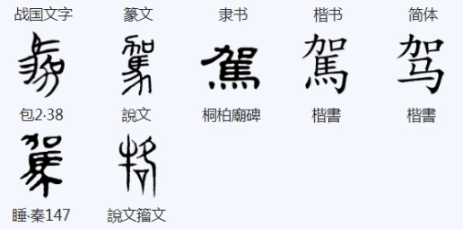 “驾”,会意兼形声字,“駕”的简体字。“睡虎地秦竹简”的“驾”字“从马从加”,是一个上下结构的会意字。“加”在这里既表声,也表示增多之意。这便是楷书“驾”的由来。