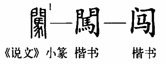 “闯”,会意字,“闖”的简体字。“从马从门”,通常用来表示向前猛冲,兼有一往无前和无所畏惧之义。这是因为马在进出大门时,不管有无门槛,总是有提起前蹄向前一跃的习惯动作,而牛在进出大门时,则会将头角低下。古人对此观之靡细,遂造“闯”字。《集韵》一书释为:“闯,出头貌。”由马出门时的向前一跃,引申后,又指突然而迅猛的动作。明朝末年的农民起义军领袖李自成,自号“闯王”,大概同他的个性中的无所畏惧有关,也可能与他的四处游击、横冲直闯有关。
