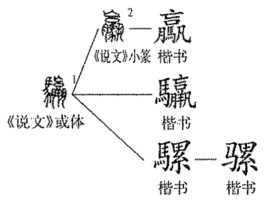 蜾蠃(guǒ luǒ)是一种寄生蜂,捕螟蛉产卵其体内,以作为幼虫的食物。古人误认为蜾蠃不产子,喂养螟蛉为子。“驘”和“䯁”字即取意这种借腹产子的传说。现代汉语中的“骡”字,源自古代的俗体字“骡”,可能取自马驴累加,血缘上连累相及之意。