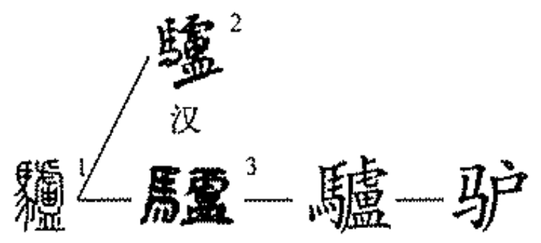 “驴”,形声兼会意字,“驢”的简体字。篆文=(马)+(盧,“庐”),盧,代表房屋,即“庐”。造字本义:在农家、作坊中服役、外形似马的力畜。隶书将篆文“马”的四足写成“馬”。