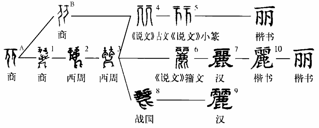 “丽”的构形源自漂亮而有所装饰的鹿角,其发音则与鹿角分岔互不粘连相交有关。因而与“离、利”为同一音系。由此引申,泛指一般意义上的漂亮、美丽。如唐代诗人杜甫《丽人行》:“三月三日天气新,长安水边多丽人。”“丽人”即美人。由于鹿角乃为一对,所以“丽”又用来表示“一对”、“耦合”的意思。如《文心雕龙·丽辞》:“丽句与深采并流,偶意共逸韵俱发。”此意后来多写作“俪”,如“伉俪”一词。现代汉语中,“丽”字多用来表示漂亮、华丽,如“丽人、佳丽、丽质”等等。