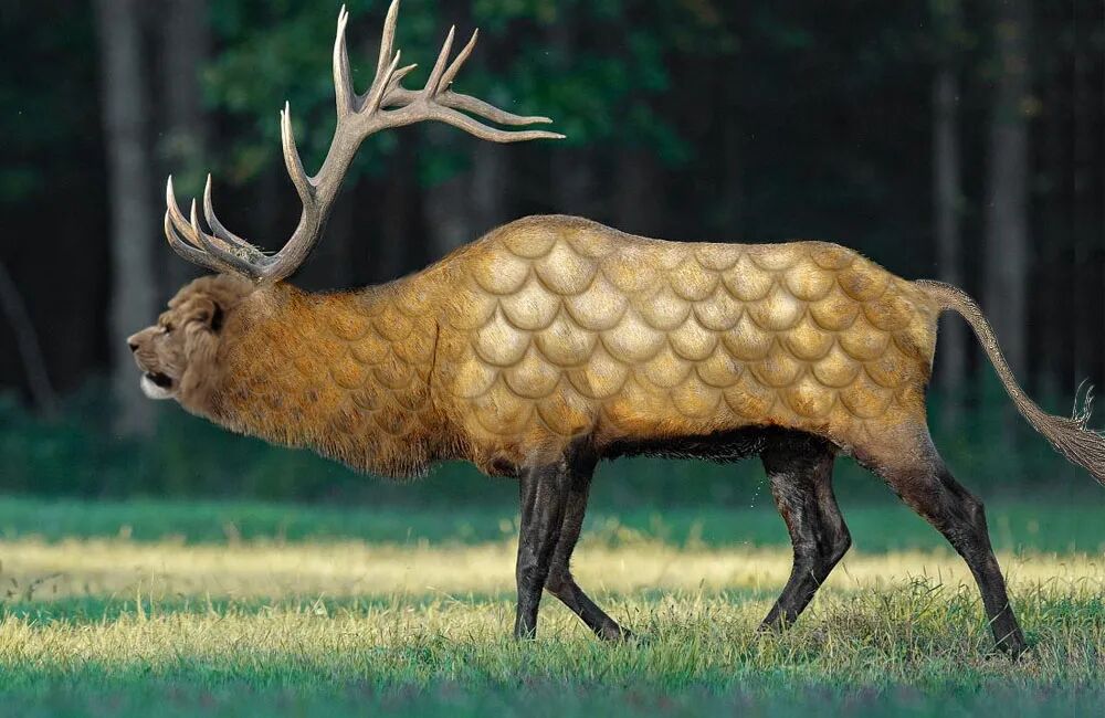 麒麟,是按中国人的思维方式复合构思所产生、创造的动物。从其外部形状上看,麋身,龙尾,马蹄(史籍中有说为“鹿蹄”),龙鳞皮,一角,角端有肉,黄色。这种造型是将许多实有动物的新合拼体,它把那些备受人们珍爱的动物所具备的优点全部集中在麒麟这一幻想中的神兽的建构上,充分体现了中国人的“集美”思想。