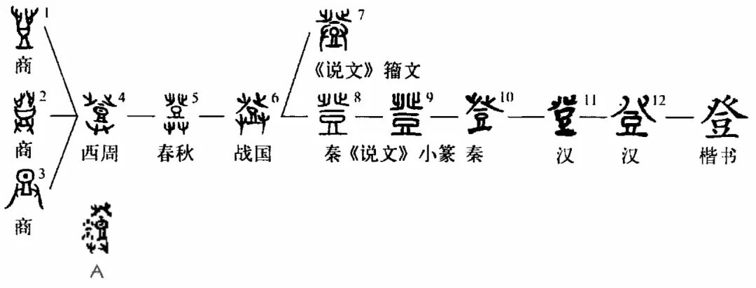 《说文》:上车也。从癶、豆,象登车形。《集韵》:或作僜。《字汇》:登与豆豋之豋,从月从又者别。