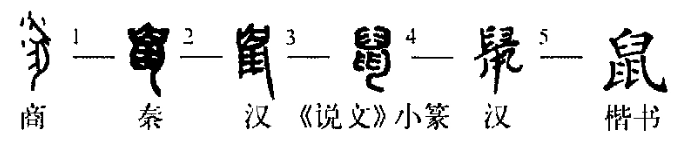 如图所示,甲骨文的“鼠”字是一只老鼠的侧视图形,头上的小点可以看作老鼠吃东西留下的碎屑,也可看作古文中的“小”字;下边是长长的尾巴。显然,这些正是老鼠的特征。金文和小篆的“鼠”字,则突出了张口露齿的鼠头和牙,啮齿类动物的特点,在此表现得一览无遗。也许,鼠类最厉害最惹人厌烦的一招,就是用牙齿啃咬东西吧。
