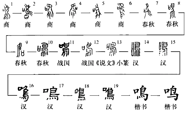 “鸣”míng,会意字,“鳴”的简体字。从甲骨文到楷体一路演化而来,其构形真正是一脉相承。
