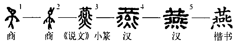 “燕”yàn,象形字。甲骨文(图1、2)的“燕”字是十分写实的燕子形象:长而尖的翅膀,尾巴分叉,还有一个像鸟似的头。“燕”字金文暂缺。发展到小篆(图3)时,字形变得匀整,也更加复杂,不仅口、翼、尾的线条对称起来,又多了表示背脊的“口”形。燕口类化为“廿”,燕翅讹为“北”,燕尾讹为“火”。小篆已经接近现代的写法了,但还是能够看到一点甲骨文留下的象形的痕迹。隶书(图4、5)、楷书笔画化,形体又变。尾部讹为“灬”,已看不出燕子的形象。