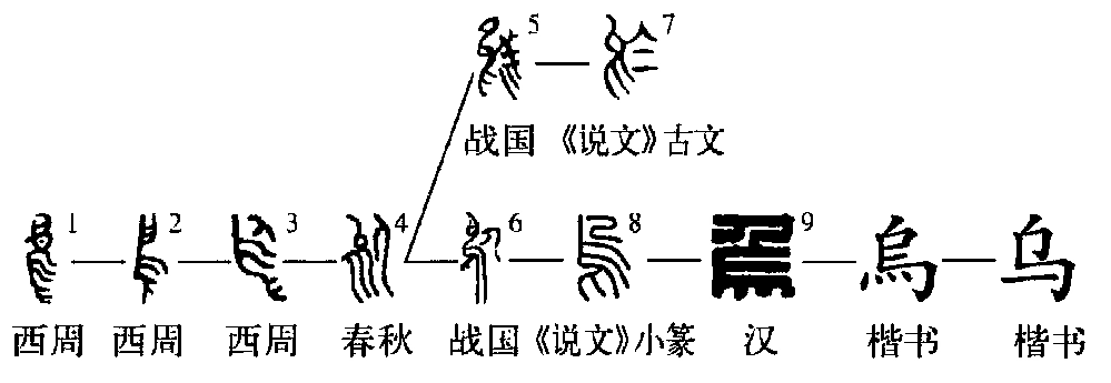 “乌”wū,象形字,“烏”的简体字。。“乌”字始见于周代早期,它所模拟的是乌鸦。“乌”的多数金文像是没有眼睛的鸟,因为古人见到的乌鸦瞳孔多为黑色,远远望去,乌鸦就像没有眼睛一样。但是有一些字形是有眼睛的,如图1。金文还有一个特点,就是向上张开的大嘴,盖因乌鸦的叫声很突出。古人便按乌鸦“张嘴好叫”、“不见眼睛”这两大特点,以鸟形来造了这个象形字。秦代的小篆(图8)也继承了这种形体,但和“鸟”字非常接近了。隶变以后,张着的嘴不见了,但依旧没有眼睛。楷书也是这样。于是,后来便根据草书楷化而成简化字“乌”。