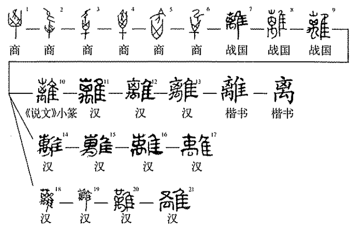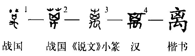 “离”(lí),会意字,“離”的简体字。“禽”(qín)是“擒”的本字,表示捕鸟。“離”,甲骨文(隹,飞鸟)+(禽,即“擒”,捕鸟),表示用网抓捕飞鸟。“離”在甲骨文出现很多款,金文用“屮”(草丛),再加“又”(抓捕),表示在草丛捕鸟。简体隶书承续简体篆文结构,将篆文字形中的“屮”(草丛)简写成一点一横的。繁体隶书承续繁体篆文结构。
