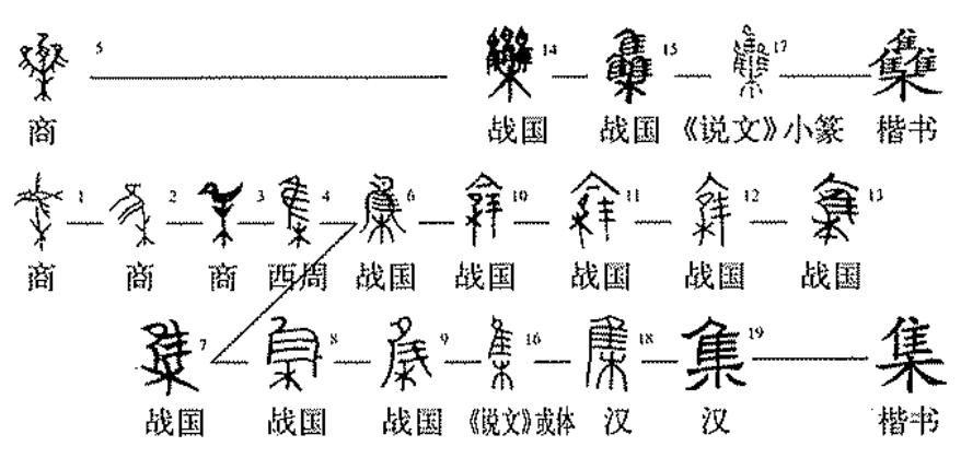 如图所示,“集”的形义相连,实为“鸟集于枝头”的意思。只不过甲骨文是木上有一只鸟,古文和小篆均为木上有三只鸟,楷书又回到甲骨文,成为木上一鸟(隹)了。《诗·周南·葛覃》:“黄鸟于飞,集于灌木。”这个“集”字就用其本义,表示聚集落下来的意思。现代汉语中,则有“集合、集聚、集体、集中”等词语。今天,人们把单篇作品编成的书册也称之为集,为“诗集、选集、文集”等。人们定期会合进行交易的市场则称作“集市”。