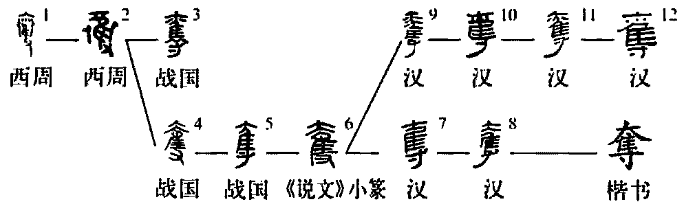 “夺”,会意字,“奪”的简体字。“奪”,金文(衣)+(雀,小鸟)+(又,手),表示徒手持衣物捕获鸟雀,与鸟雀争夺田里的庄稼。在人与自然和谐的远古时代,鸟类对人类的警惕性低,容易徒手捕捉,因此古人用衣服就可以在田野或草丛捕捉小鸟。篆文误将金文字形中的“衣”写成“大”,误将篆文字形中的“雀”写成“隹”。造字本义:动词,徒手持衣物捕获鸟雀。隶化后楷书将篆文字形中的写成“奪”,将篆文字形中的“又”写成“寸”。《汉字简化方案》中的简体楷书“夺”,省去正体楷书字形中的“隹”。