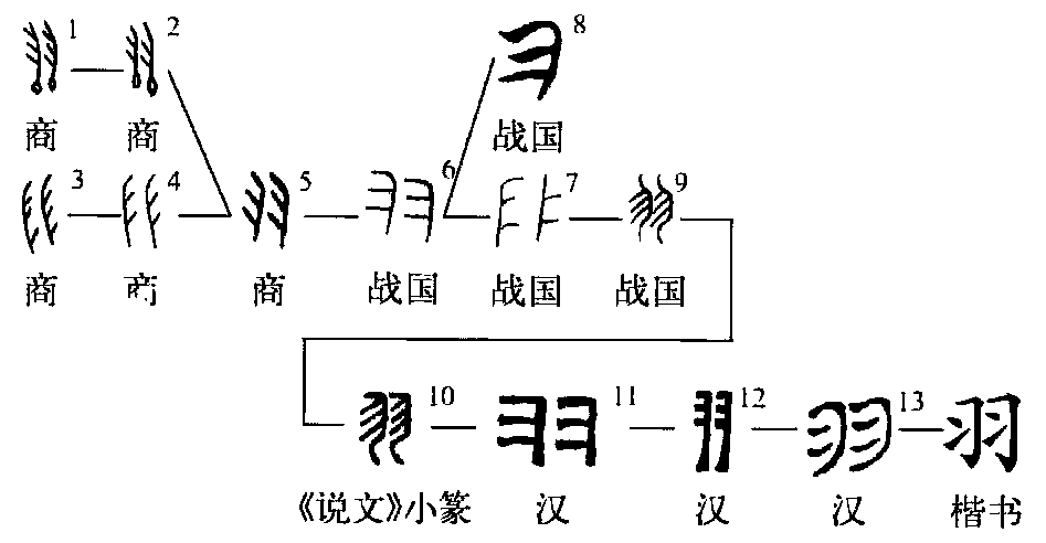 “羽”,象形字。商代甲骨文已经出现,像两根鸟羽的样子(图1-5)。但凡一根羽毛,都有一根主干(羽轴),两旁长满了羽绒状的东西(羽枝)。也有人认为,甲骨文的“羽”描绘的是鸟的翅膀。至战国时,羽枝一般作两支,个别的作三支(图3),但方向还不固定,鸟毛居左、居右者都有。造字本义:鸟的翎(líng)毛(鸟的翅膀或尾巴上的长羽毛),覆盖体表的器官,轻韧防水,有护身保温作用。楚简、篆文基本承续甲骨文字形。