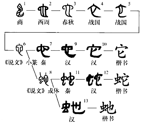 “蛇”,象形字,像蛇之形。“虫”、“也”、“它”同源,都是“蛇”的本字,后分化。甲骨文蛇形有单画双钩之别。单画者作“令”形,为”虫”(“虺”huǐ本字)之初文;双钩者即(图1)形,为“它”(“蛇”本字)之初文。金文承续甲骨文字形,有的金文(图3)将棱形的蛇头写成“宀”形,并在蛇的“大腹”部位加一竖指事符号,表示蛇腹中的吞噬物,强调蛇腹神奇的弹性与消化能力,突出“蛇吞象”的特性。“它”字经历代不断发展,线条逐渐平直化,像蛇头的部分逐渐演变成“宀”形,像蛇身和蛇尾的部分逐渐演变成“匕”形。由于“它”在古籍中常被借用,秦汉时期又产生了个后起本字,即在“它”的基础上增加“虫”旁,形成“蛇”(图11)字。“蛇”字异体写作“虵”,那是因为“它”有所讹变,与“也”混同了。“佗”又作“他”、“沱”又作“池”等例子也属同类现象。隶化后楷书将“蛇”篆文字形中的“虫”(图11左半边)写成“虫”,将篆文字形中的(图11右半边)写成“它”。“它”的本义是蛇,这个意义后来写作“蛇”。