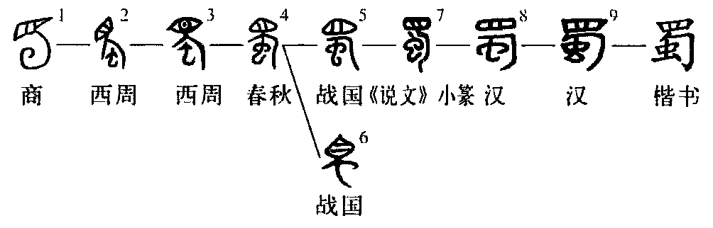 “蜀”shǔ,象形字,本是野生柞(zùo)蚕的名称。甲骨文的“蜀”字上部乃柞蚕的大眼睛;下部则是野蚕可以蠕动蜷曲的身体。当然,“蜀”字的上部也可视作柞蚕身上的睛形花纹,下部视作柞蚕所吐之丝。甲骨文中另有作(图2)款,乃是在“蜀”下添加“虫”形而指称其类属。金文的“蜀”字承接甲文(图2)款,因而演变成一个会意字。小篆的形体,基本上与金文的形体相似。楷书一脉相承写作“蜀”,“蜀”的本义是“柞蚕”。《说文解字》因此释为:“蜀,葵中蚕也。”