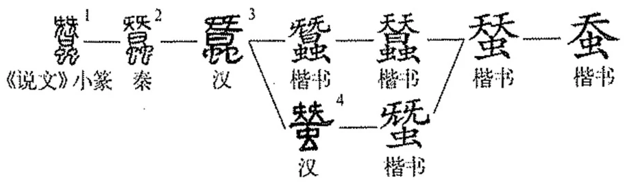 朁,既是声旁也是形旁,表示发丝交织的发髻。“蚕”,会意字,“蠶”的简体字。甲骨文