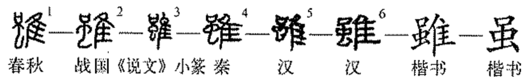 “虽”suī,会意字,“雖”的简体字。金文的“虽”字,左边下部是一个“虫”的象形,上边是一个“口”,表示蚕蛾从茧中破壳而出。右半部的“隹”,则表示蛾是一种能飞的昆虫。十分形象地把蚕蛹及其他鳞翅类昆虫的嬗变过程表现出来。小篆和隶书的“虽”字承接其后,楷书简体取其一半,简省为“虽”。“虽”是一个表示行为状态的会意字,很久以来便用作虚词,因而古人多不识此字的形义来源。例如,许慎在《说文解字》中便将“虽”释为似蜥蜴的虫子。后人更顺竿而上,说“虽”是什么藕塘中背部有花斑的水蜥蜴。