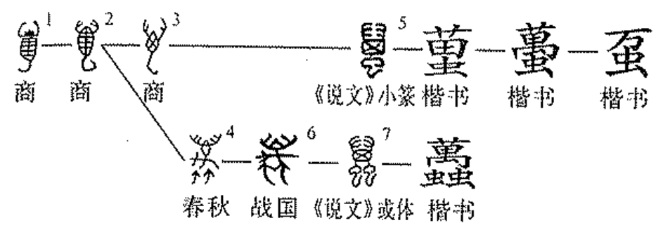 “虿”是一个后起的会意字,“蠆”的简体字。。“万”是“虿”chài的初字。因为“万”字早在殷商时代已被借用为数词,即百千万的“万”,人们只好另在“万”下加“虫”,来表示“万”的本义,即蝎子。《说文解字》释曰:“虿,毒虫也。”《诗·小雅·都人士》:“彼君子女,卷发如虿。”这是以蝎子的尾巴形容女子头发向后卷曲。