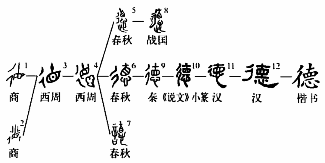 “德”,会意字。会意兼形声字。从甲组图1的甲骨文形体来看,它的左边是“彳”(chì),它在古文字中多表示“行走”之义;右部是“直”字,其字形像一只眼睛上面有一条直线,表示眼睛要看正;二者相合就是“行得要正,看得要直”之义。“直”也有表示读音的作用。甲组图2的甲骨文是“行”字中间一个“直”字,它所表达的含义与甲组图1是一样的。西周金文的形体与甲骨文的形体基本相似,只是有的字形在右边的眼睛下加了一颗“心”(图4),这时的人们又给“德”字的含义加了一条标准,即除了“行正、目正”外,还要“心正”,可见人们对“德”字的含义标准要求越来越高。大约到春秋,“直”字上部一竖渐变为“十”字形(图6)。《说文解字》小篆在“目”下加个“拐横”。这样一来,秦始皇用小篆“书同文”后之“德”字,便固定了下来。此后的楷书也只是对其笔画稍作规整而已。