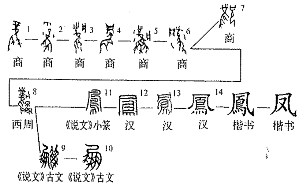 “凤”fèng,初为象形字,“鳯”的简体字。商代甲骨文像高冠、丰羽之孔雀类鸟形。由于它经常借用以表风,故其身旁每加若干小点表示风尘,或头上加雨成为会意字,表示雨常与风相伴。到商代晚期,始加声旁“凡”而为形声字,凤与凡声韵并同。或加“兄”为声旁,然声韵与凤相去较远。西周时也使用凡声。《说文》所载两个古文凤,并象形字。《说文》采纳了战国以来从鳥、凡声的结构,隶变后楷书作鳯,简化作凤。凤字始见于清代刊行的《目连记弹词》,现为正字。本义是孔雀类所谓凤鸟。