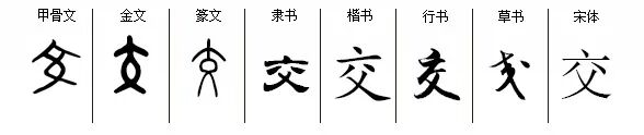 “交”jiāo,象形字。甲骨文“交”=“六”+“爻”(爻yáo象,世间万物在不断地交流变化)。造字本义:万物(天地人)交织变化。