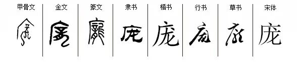 “庞”páng,会意兼形声字,“龐”的简体字。甲骨文和小篆的字形,均为上下结构:上半部的“广”字,表示三面有墙、一面敞开的大屋或大房子的屋廊;下半部的“龙”字,则表示爬行或蜷曲在屋廊下的蟒蛇。楷书依据简化法则写作“庞”。