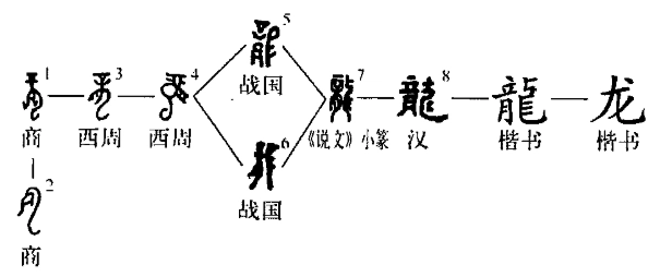 “龙”字从大篆向小篆的发展,体现了雄浑的气势与协调的美感。这时期的“龙”字开始分裂为两半部分:右半部分躯体变得更长,甚至需要用弯折来表现;左半部的形态也更显怪异,力求字形对称而显出一种稳重感。这时期的“龙”字与器皿上的诸多造型相互呼应,多了一些贵族气,少了平民性,真实写意被夸张想像所取代,逐渐演变为皇权、帝王的专用象征。