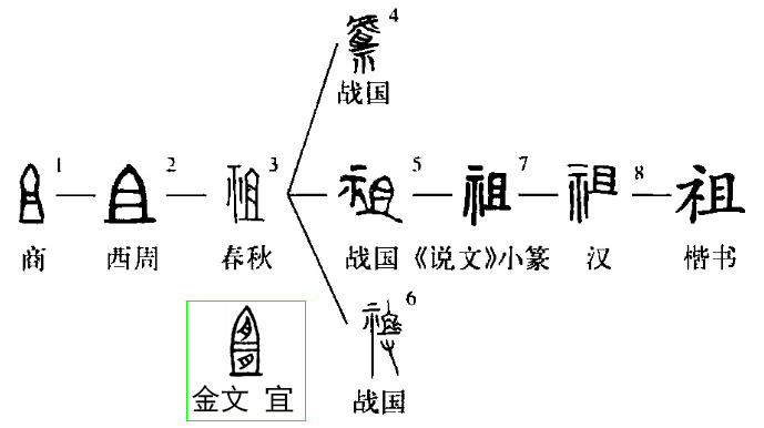 “且”是“祖”和“宜”的本字。“且”,甲骨文在表示‘肉’的古“月”字下加一横,有的甲骨文写成混合结构的会义字=(月)+(=),进一步明确“且”是平分肉食。(古肉字像月,有的甲骨文为一横)在原始的共产平分时代,食物是平分的重点对象;因此平分肉食,就成为祭祖敬神日的重要仪式。“且”的“祭祖”本义消失后,甲骨文再加“示”另造“祖”代替。“且”从“平分肉食”的本义中引申出“适宜、恰当”的含义,当“且”的“适宜、恰当”含义消失后,甲骨文再加两个“月”(肉)另造“宜”代替。