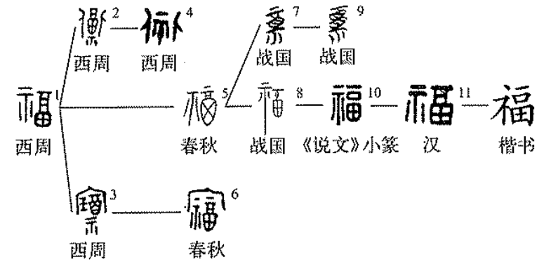 “福”fú,会意兼形声字。甲骨文=(示,祭祀)+(酉,酒坛)+(双手,表示捧酒献祭),表示巫师用美酒祭祀祈祷。造字本义:用美酒祭神,祈求富足安康。有的甲骨文省去双手,简化为酒坛和祭祀"示"。金文调整左右结构。篆文将金文的酒坛形状改写。