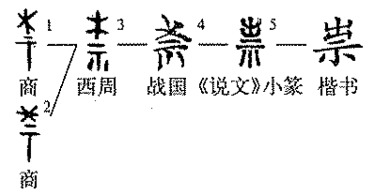 “祟”suì,会意字。始见于甲骨文,从示,从木,古人进行占卜前会燃烧木柴,在卜甲取出前出现灵异现象称为祟。引申指鬼神之祸。“祟”字在战国时期,所从之“木”旁讹变为“义”,至秦代文字中又进一步讹变为“出”,至楷书中则变为“出”,与“进出”之“出”字形同。