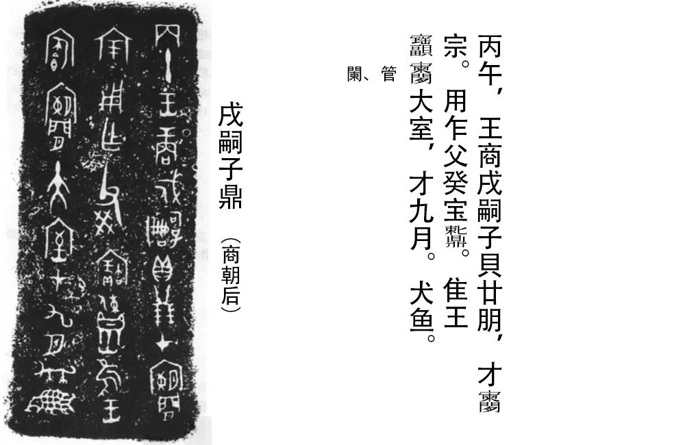 译文: 商某王某年,九月丙午这天,商王在宗庙明堂大室赏赐给戌嗣子鼎贝二十朋,戌嗣子因受荣宠,作了这件祭祀父亲的宝鼎。铭末“犬鱼”为戌嗣子所属家族的族徽。