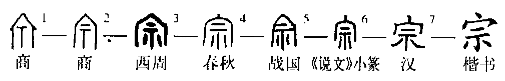 “宗”zōng,会意字。甲骨文(图1、2)的“宗”字,上部是“宀”(mián),像房屋的侧视形,此处可视为庙宇;下部是“示”,像祭台,表示祖先的牌位。古人一般在室内祭祀祖先,所以“宗”是放置祖先神主的房屋。甲骨文“宗”里的“示”一般写作一横一竖或两横一竖。后来为了字形的匀称,又在竖两侧加上了装饰性的笔画,变形“示”形,这种写法一直沿用下来。西周金文(图3)与甲骨文大致相同。大约到春秋时期,有一部分字形的“宀”上表示屋脊的部分变为一点(图4),并为隶书(图7)和楷书承袭。从甲骨文到小篆,“宗”字一直为半包围结构,隶书和楷书笔画变得平直,字形变为上下结构。