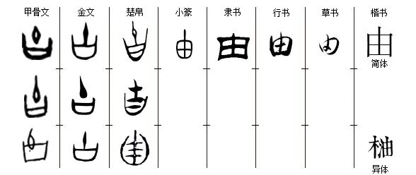 “由”yóu,指事字。甲骨文“由”字像一滴油滴入器皿。中国旧石器时代的西侯度人在距今至少在183万年前已经会使用火,这意味着中国人很早就发现烧烤肉食时熔滴下来的油脂具有特殊的香味和滋味,将其收集起来,用作食物的调味品,能够获得令人满意的口感和一定的热能,从此开始了人类利用动物油的历史。“由”字出现得很早,以至于其本义早已被“油”所替代,因而“由”的异体字和引申义极其多,不详列。
