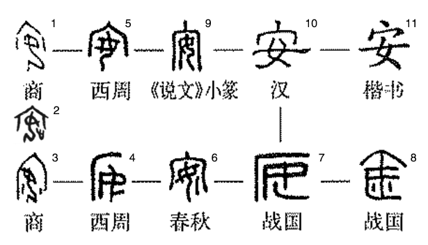 “安”ān,会意字。早期甲骨文中的“安”字(图1)由三个象形的独体字组成:(宀,房屋)+(女,女人)+(止,脚的象形,表示行动)表示妇女从室外走进房内坐了下来。造字本义:内心踏实、宁静、安详。在上古时代,毒蛇猛兽等人类的天敌很多,妇女的体质和体力都不如男子,在野地里不安全,只有在室内可免受侵害。因此,中国人的祖先便以“女坐室内为安”而造“安”字。晚期甲骨文中的“安”字中(图3),保留了早期甲骨文中“安”字的“女”、“宀”两个部分,但把“止(脚)”变为“女”下的两点。之后金文中的“安”字(图5)将女下的两点已进一步简化为一点,而且把女的坐向反东为西了,坐姿也去掉了。再之后,小篆中的“安”字(图9)进一步把“女”下的一点彻底去掉了。在此基础上,隶书中的“安”字(图10)把“房”改作宝盖头(宀),敛手腹前的妇女形象则改作“女”,由此而楷化为如今的“安”字(图11)。在字义上,“安”字的本义是平静,引申指静止,又引申指舒适、稳妥等。