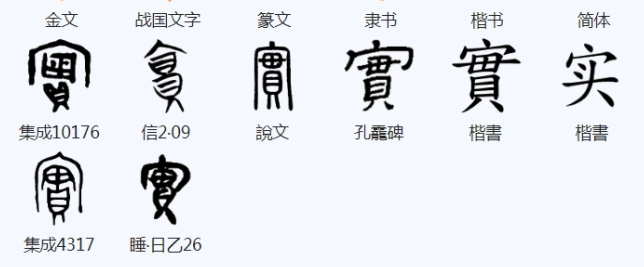 “实”shí,会意字,“實”的简体字。《说文》:“实,富也。从宀,从贯。”这里的“贯”是“田”和“贝”的误写。金文1上边的“宀”(mián)是房屋形,中间是一串贝的象形,下边是表示货币的“贝”,可见有房有贝是富裕殷实的人家。商朝时期,5个贝=串,10个贝=朋。1贝可以买1.95亩地约1300平方米。由此可见,贝币在商朝时期的价值远超乎今人的想象。即使在贝币流通的时代,普通百姓依旧以物易物的形式来换取物品,只有上流社会才使用贝币。如有一串贝,在当时已是相当富有的人家。“实”字本义是富裕,家里有许多财物,由此引申为名词,指财富。小篆从宀从贯而写,直至今文。