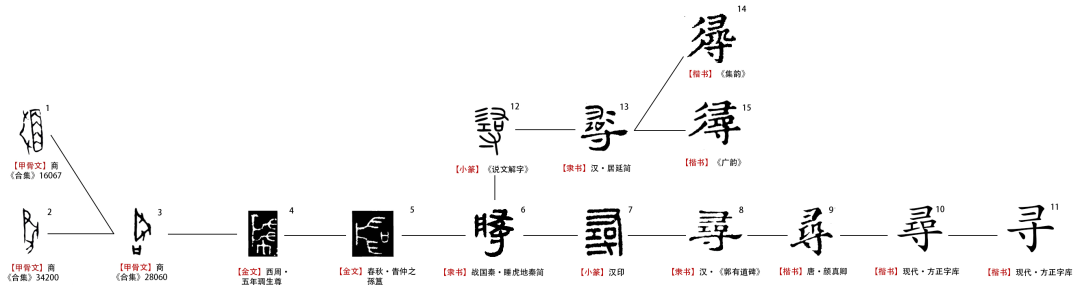 “寻”是“尋”的简体字。甲骨文的“寻”字,左半部是一个古文的“十”写作一竖。右半部乃是两臂伸长后,以双丈量物体的象形描述。甲骨文后一款则以席子的形状表示物体长宽各一寻(即常)。《说文解字》释为:“寻,度人之两臂为寻,尺也”。这是说,伸开两臂的长度,恰合古代的八尺。小篆的“寻”字十分繁杂:内有“工”表示穿通之义,有“口”表示双臂挥动后的绕圈,有“彡(shān)”表示很多,双手之形则演变为上部的“又”和下部的“寸”。楷书一脉相承,简化后写作“寻”。