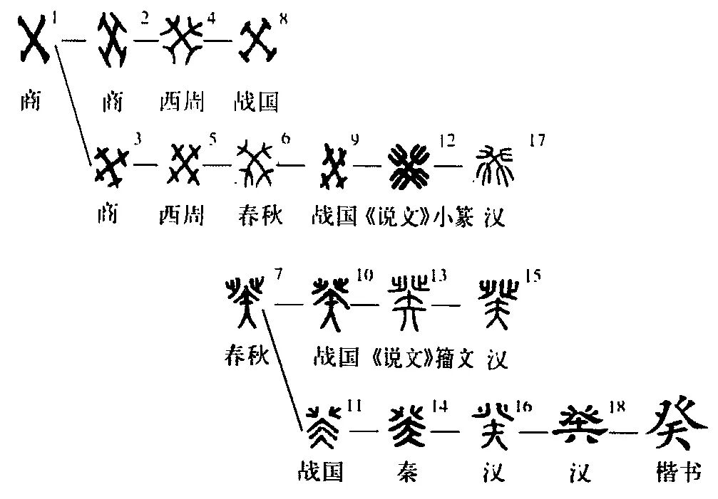 “癸”字最早见于甲骨,作图1,似二物相交状,稍复杂的写法是在四角添加短划,有出头和不出头两种构形,分别作图2和图3。以后分别沿着这两个方向发展,前者至东汉时期尚无太大变化,仍作为“癸”字的异体存在,东汉以后湮没不闻;后者最晚可见于战国时期。而自春秋时期出现另有一种从矢从癶作图7的构形,其所从之癶(bō)概即《说文》所云“象人足”所据。秦汉之后这种写法逐渐成为主流,随着时代的迁移而略有变形,至楷书则变形为上癶下天的“癸”。