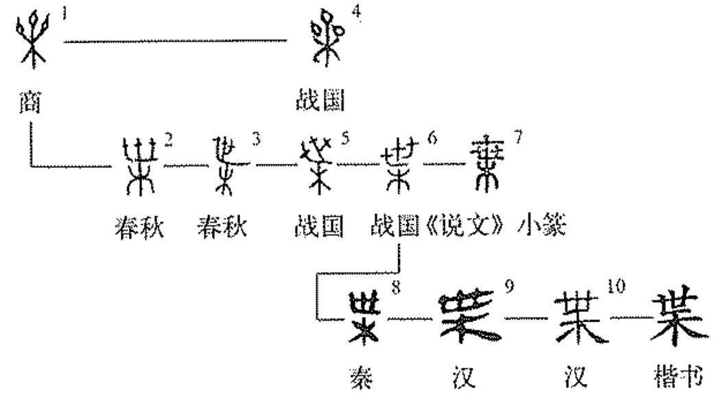 “枼”yè,象形字。甲骨文像树上长有树叶,是“葉”字的初文。在春秋文字中,像树叶的部分与树干分离成为“世”字(充当声旁)。秦汉文字的“枼”有两种写法:一为古隶,一为《说文》小篆,楷书的“枼”字由古隶演变而成,而小篆演变至“枽”,现为“枼”的异体,本义是树叶。“枼”作为单纯字件后,楷书再加“艹”另造“葉”代替。在古文字材料中“枼”字多假借为“世”。