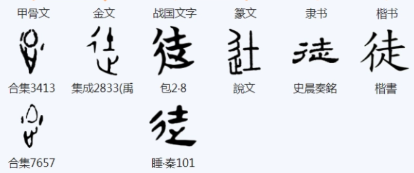 “徒”的构形源自在黄土路上行走。《说文解字》释为:“徒,步行也”,由步行之义引申,又特指步兵,如《左传·隐公九年》:“彼徒我车,惧其侵轶我也”。“彼徒”是说对方是步兵,“我车”是说我方乘战车。又由步兵跟随战车之后,引申出“跟从、随从”义,特指门徒,徒弟。由徒步行走的没车没骑,引申出“没有凭借、空的”的意思,如“家徒四壁,徒托空言”等。词义虚化后,又引申为白白地、不起作用,如“徒劳、徒自惊扰”等。