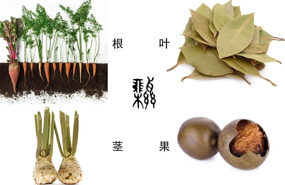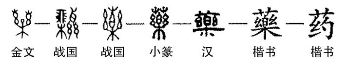 “药”yào,形声兼会意字,“藥”的简体字。“药”字最初见于春秋时期。战国时期的一款“药”(图2),由四个构件组成,分别为“植物根”、“植物茎”、“植物叶”、“植物果实”组成,由此可见中药的各组成部分清晰可见。发展到现代汉语阶段,简化作“药”。