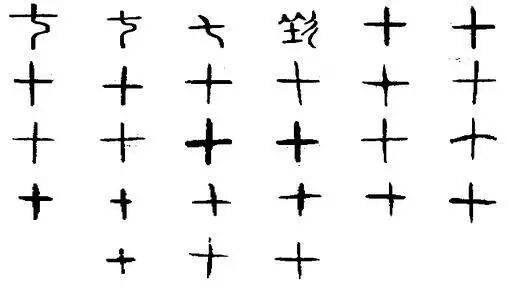 “十”字也是汉字中的一个构字符号,通常用竖表示直出直下。如古文字中的“古、直、隼、博、協”等。它们构形中的”十“均由一竖演化而来。