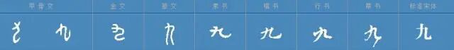 金文的”九“字,基本结构未变,只是下部的卷曲食指有所变形,这乃是为了适应汉字的方块形状所作出的变化。小篆和楷书缘此而写作”九“。