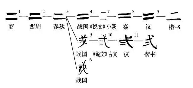 “三”字本用三横表示数量,战国文字中或在原形上追加“戈”或“弋”为繁形,其中加“弋”之形一直沿袭至汉代。甲骨文“三”字作“三”,三横等长,“气”字作“三”,中间一横较上下两横短,二字是有严格区分的。