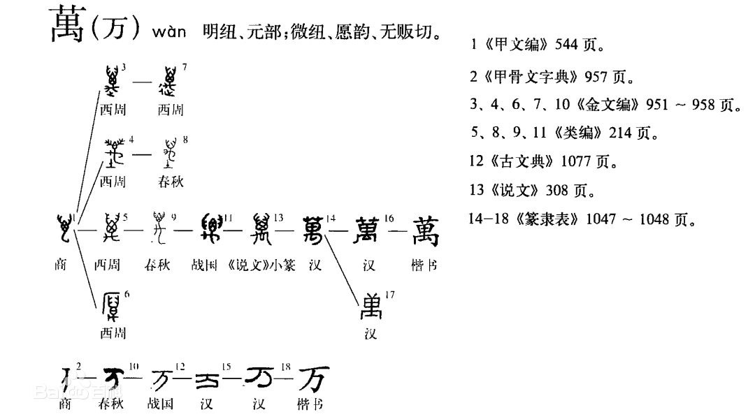 “万”是“萬”的简体字,这是一个象形字,假借表义的汉字。甲骨文的“万”字,像一只大螯曲尾的蝎子图像。小篆的“万”与金文构型相似,只是下部的以手捉拿之形发生讹变。楷书缘此写作“萬”,汉字简化时规范为“万”。蝎是一种喜欢群居的昆虫,尤其是在交尾孵化时期,更是密密麻麻,成百上千的聚集在一起。至今,在黄河沿岸的黄土缝隙中,仍能看到这种情景。大概正是由于这种量的群聚,加上质(毒性让人产生恐惧型夸大)的作用。上古先民假借“万”为数字单位,又另造“虿”(蠆)专指蝎子。《广韵》释为:“十千为万。”