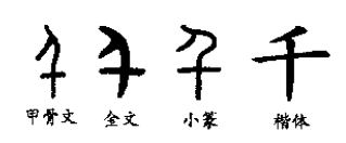 “千”,这是一个指事字。甲骨文的“千”宇,乃是在侧立人形的腿上加一短画,以小腿上的汗毛来强调“千”之数。因为“千”这一概念无法用具体事物來表述,故用人腿上数以千记的汗毛假借表示数字“千”。金文、小篆和楷书的“千”字与甲骨文构形基本相同,仅仅是“人”形逐渐演变,到楷书时,人形已是有踪无影。