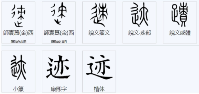 “迹”,会意兼彩声字,金文的“迹”由(辵,行走)+(朿,刺、戳),造字本义:行走时戳印在地上的脚印。篆文写成形声字“迹”。篆文异体字为(足,脚印)+(责,“積”的省略,累积),表示脚印所构成的行踪留痕。