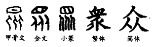 “众”是“衆”的简体,这是一个会意字。甲骨文字形为上下结构:上半部是一个“日”形符号,表示目标或目的地;下半部是三个“人”字的组合。两形会意,表示很多人往同一目标行进。