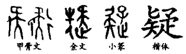 “疑”的本义指迷惑、无法确定。甲骨文的“疑”字,像一个人持杖出行,左右旁顾之状,表示出行迷路,疑感不知所往的意思。甲骨文的另一款则增添了一个表示道路的符号,使出行之义更为明晰。金文承接甲骨文,但在下部增“止”表示“行走”,加“牛”表示寻找遗失之牛,使“疑”字的构意更为有趣,也反映了农耕在两周金文时期的重要地位。小篆在演变过程中,将人头回顾之形讹写为“匕”,人形的“大”讹为“失”,右边的“牛”形讹变为“子”(表示寻找孩子),逐步演变成为今日楷书的“疑”。