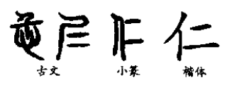 “仁”,乃孔子儒学的核心概念,一部《论语》,五十八章共有105个“仁”字。东汉学者许慎在《说文解字》中录下了两敕古文和一个小篆的“仁”字。如图所示,最初的“仁”字是一个会意字。上为“千”,人腿下部有一横;下为“心”的象形。两形会意,“仁”,乃是有一千个心眼,或一千种心思的聪明“人”。另一款的“仁”宇,右上部是个“人”的象形白描,在其左下部,则是一个古文的“上”字。两形会意,表示“仁”乃“上人”,即上等阶层的“人”。小篆一脉相承,楷书在隶变过程中,照猫画虎写作“仁”。