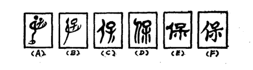 保,会意字。图(A)是图形文字的“保”,是大人反手背着一个小孩(子),小孩正举起一手,作欢呼状。这就是“保”。把孩子背在背上,反手垫着孩子的屁股,加以保护,防其下跌,这便是“保”的原义。图(B)是甲骨文的“保”,仍不失反手背子的形状,但线条已简化得多了,背孩子的大人已省去头和脚,而孩子的头变为“口”形。这个会意字发展到金文(图C)阶段时,讹变很大,孩子离开大人而独立,背子的大人已不反手回臂,而且已变成“亻”旁放在“子”左,与“子”平排并立了。使人难以理解的是,在“子”的右下方平添了一短撇,至今还不明其意。到了图(D)的小篆阶段,“保”字的形体结构更在“子”的左下方又再平添了一短撇,这样,“子”竟变成“呆”形了。于是以小篆为基文,隶变为图(E),楷书的字形基本沿袭了篆文的结构,只是把篆文的曲笔变成了容易书写的直笔。楷化为图(F)的今天的“保”字。“保”的“保卫”、“养育”、“保育”的原义依然不改。