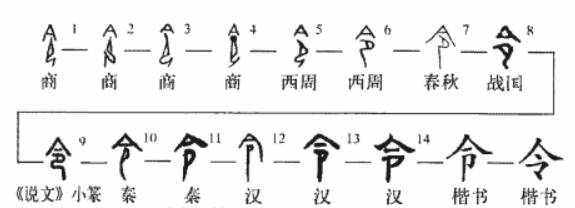 “令”,有人认为上部的三角形模拟发出号令的木铎,下部模拟受命的人。也有人认为,这三角形,是古代集合的“集”字,表示将众人集合到一起,一个个跪着,由首领发布命令。林义光《文源》认为这三角形是一个朝下张开的“口”,跪着的人在听长官用嘴发布命令。还有人认为,这三角形表示房屋,表示一个人坐在屋里接收命令。