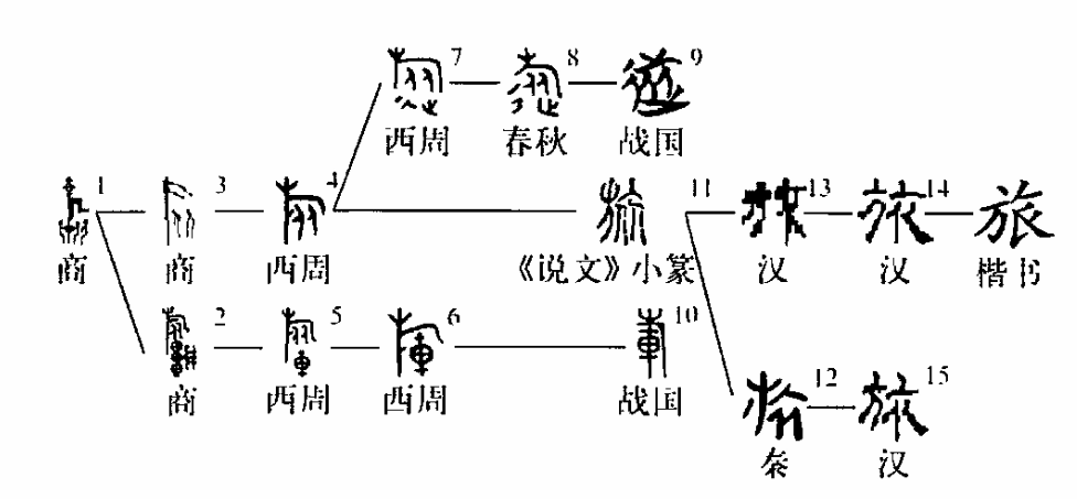 “旅”,这是一个会意字。甲骨文的“旅”字上半部是一个“㫃yǎn”字,乃是上古旗帜的象形图象(古代的旗帜用野兽皮条或尾巴做成);右下部是两个人,表示氏族战士跟随军旗行进。金文则是在战车上插上一面大旗,兵士聚集在大旗的周围。小篆关似甲骨文,在大旗下有两个人(士兵),楷书的”旅“字发生形变,下部的两个人演变成上下结构的“旅”的本义为兵士的武装出行,也可视作军队的开拔,即“军旅、军队”的意思。由军队的出征之行,又引申为古代军队的编制,即军师旅团中的“旅”。《说文解字》曰:“旅,军之五百人为旅。”如《左传·哀公元年》:“有众一旅。”即有军队五百人。由军队的出征之行,又引申为在外旅行。但“旅”在古代通常表示许多人的结伴而行,如《礼记·曾子问》:“三年之丧,练不群立,不旅行”其中的“旅”即结伴而行的意思。由旅行又引申出旅居之义。如“羁旅之臣”即表示寄居在外的臣子。由寄居之义又引申为旅客,如“商旅一词,表示出外经商的人;“行旅”则表示出行的人;“旅馆”则是行旅之人歇息之处。